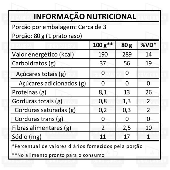 (*) % Valores diários de referência com base em uma dieta de 2000Kcal ou 8400KJ. Seus valores podem ser maiores ou menores, dependendo de suas necessidades energéticas.(**) VD não estabelecido.